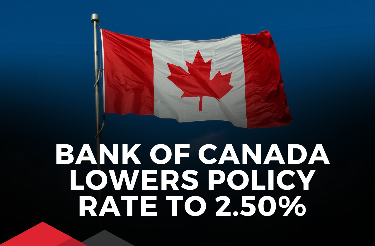 The Bank of Canada lowers policy rate by 0.50 basis points to a new policy rate of 2.50%.